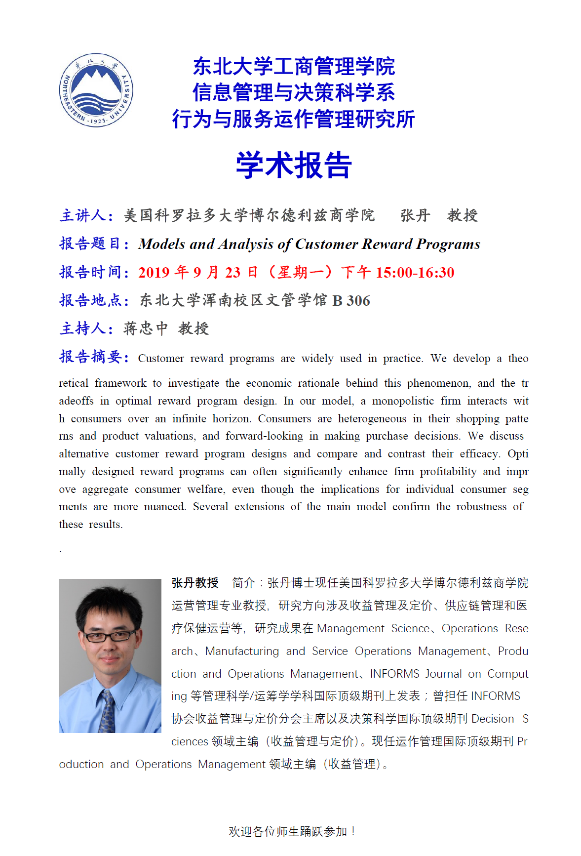 邀请美国科罗拉多大学博尔德利兹商学院张丹教授学术报告