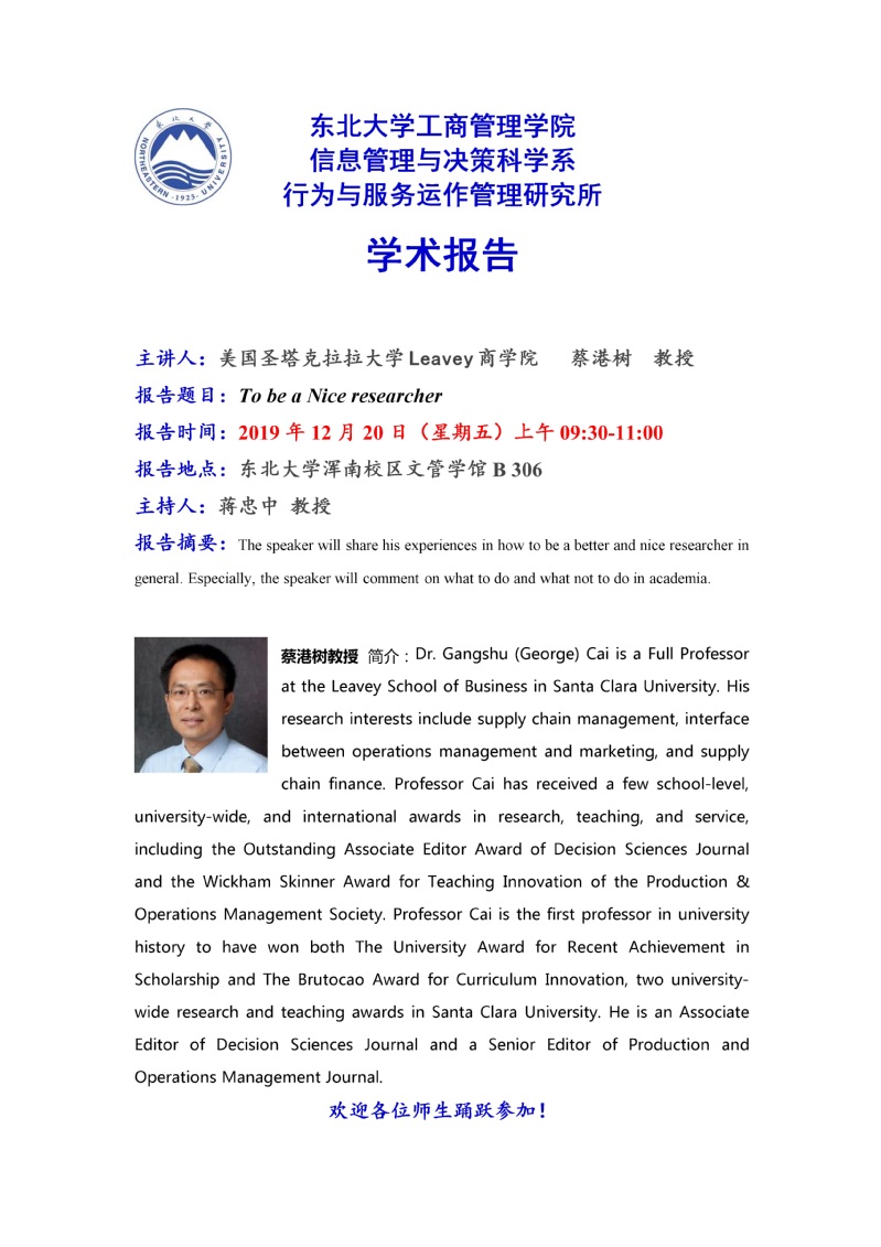 邀请美国圣塔克拉拉大学Leavey商学院蔡港树教授学术报告