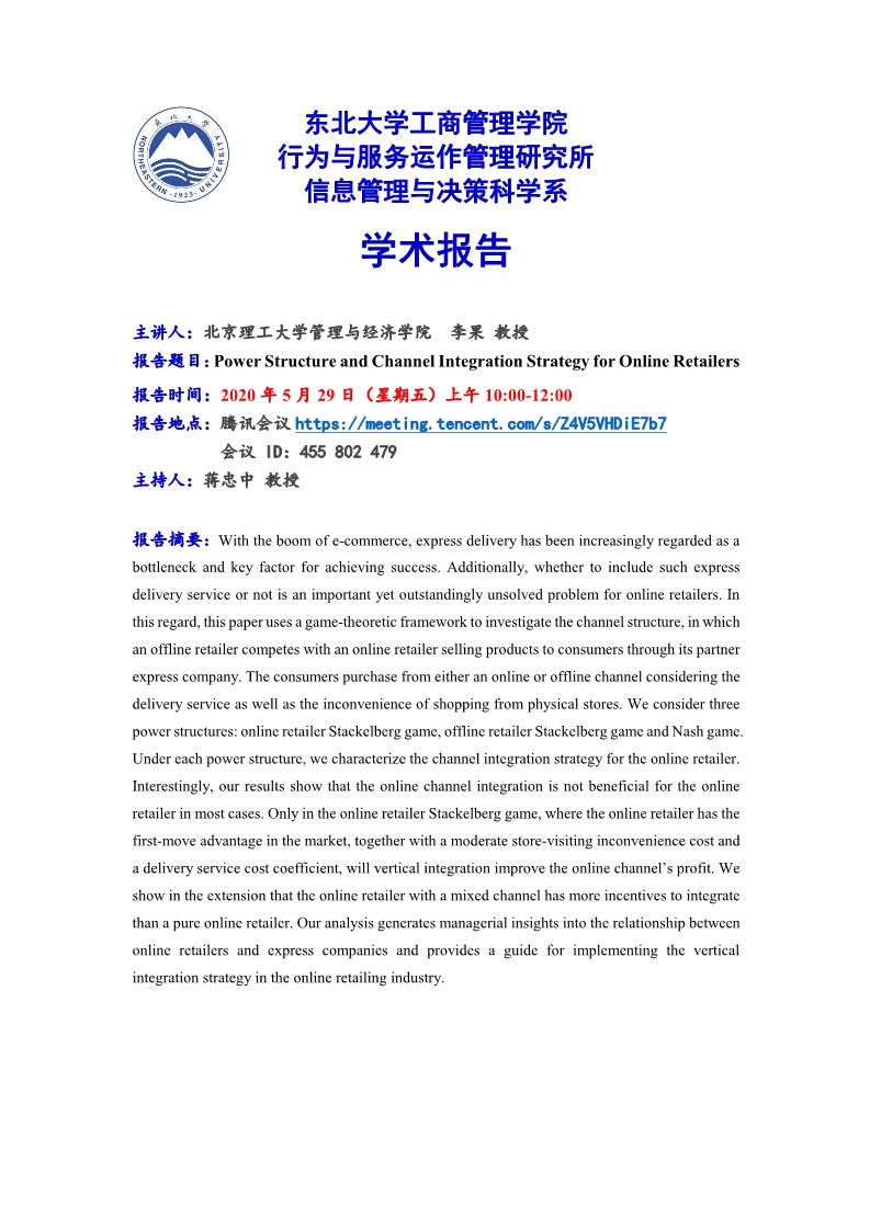 邀请北京理工大学管理与经济学院李果教授学术报告