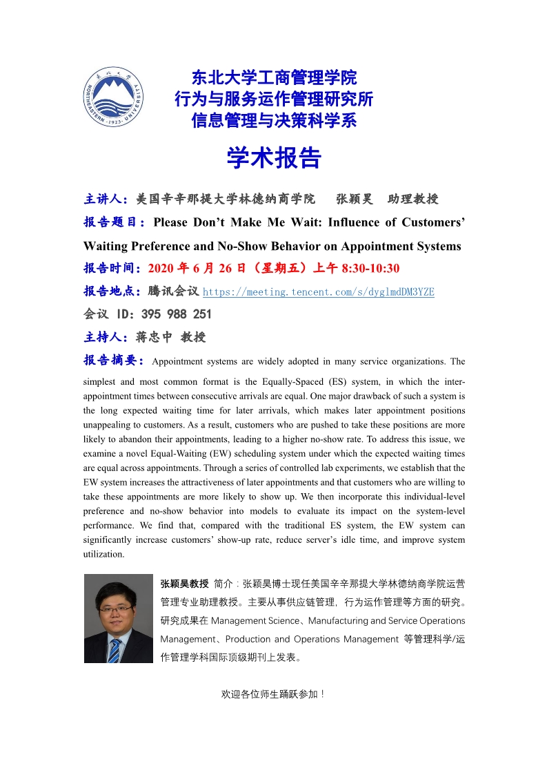 邀请美国辛辛那提大学林德纳商学院张颖昊博士学术报告