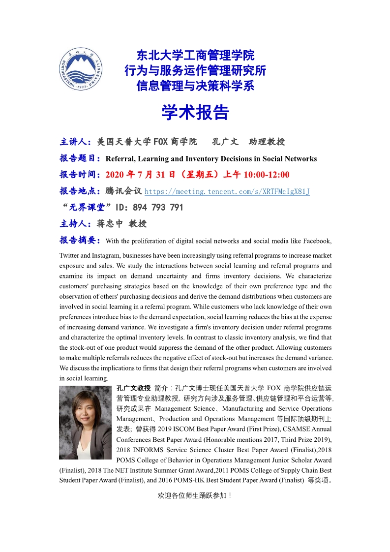 邀请美国天普大学FOX商学院孔广文助理教授学术报告