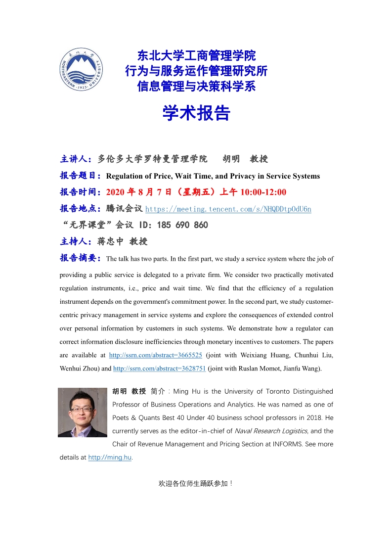 邀请多伦多大学罗特曼管理学院胡明教授学术报告