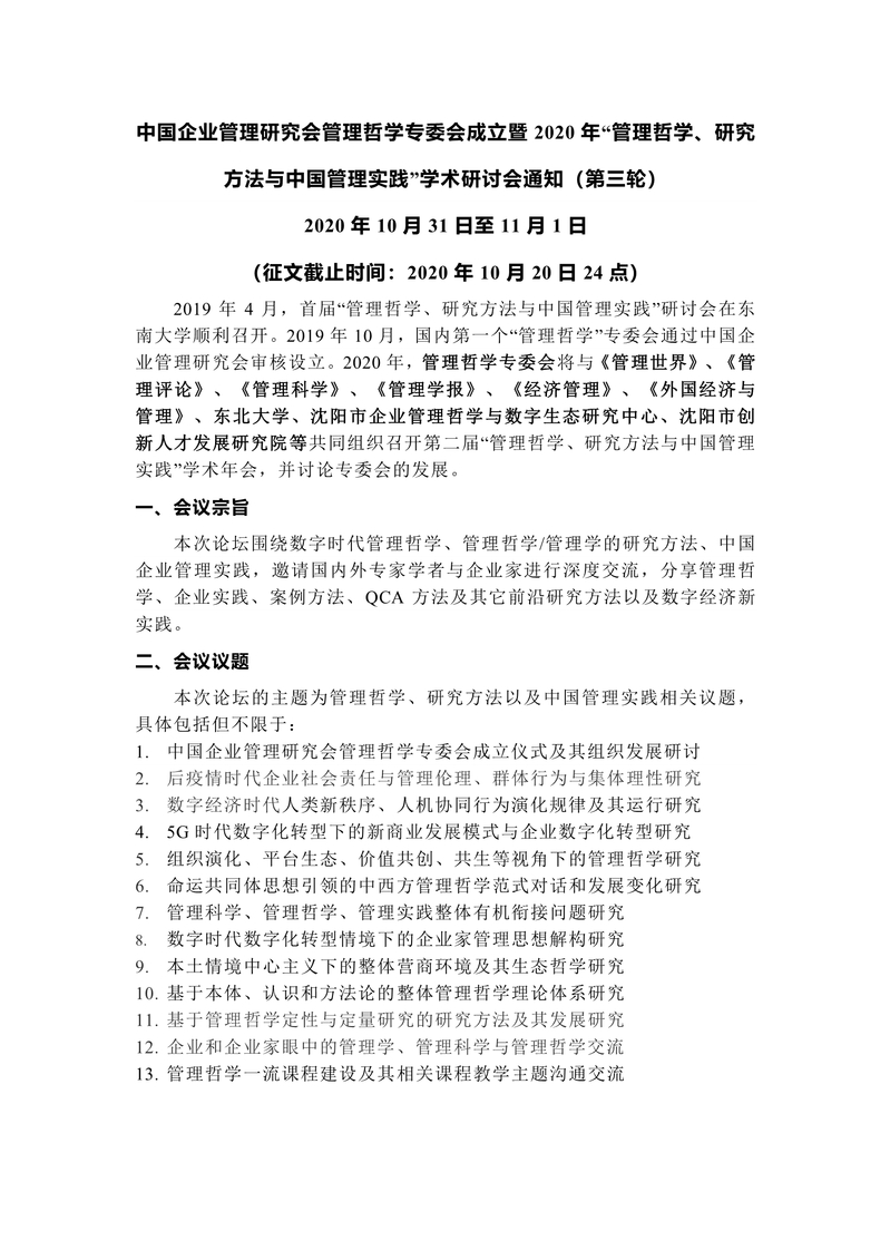 中国企业管理研究会管理哲学专委会成立暨2020年“管理哲学、研究方法与中国管理实践”学术研讨会通知