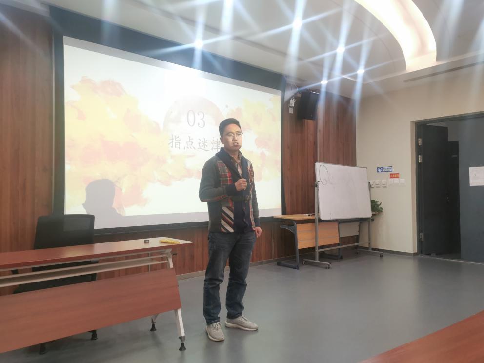 周老师介绍完后,辅导员芦书豪老师上台为同学们指点迷津,就大二学年的发展目标提出许多指导意见。芦老师指出,作为新时代的大学生,同学们应当注意在表达能力方面的培养和提升,无论在答辩展示之类的正式场合还是朗诵阅读这样的文体活动中,表达、表现能力都是至关重要的。