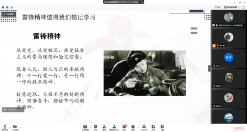 佟硕同学为大家讲解雷锋精神的具体内容,他提到,我们作为新时代的大学生,要进一步高举雷锋精神的旗帜,在学习、生活中,以积极进取为荣、以消极落后为耻,开展学习雷锋活动,共建和谐校园,与时代同步,与雷锋同行,与时俱进,开拓创新,立足校园,做好模范带头作用。