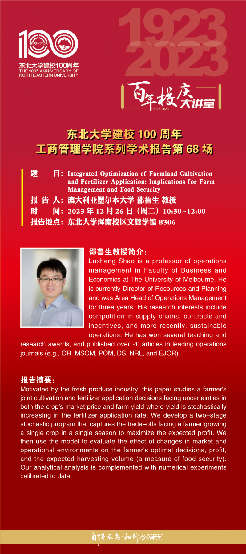 邀请澳大利亚墨尔本大学邵鲁生教授学术报告