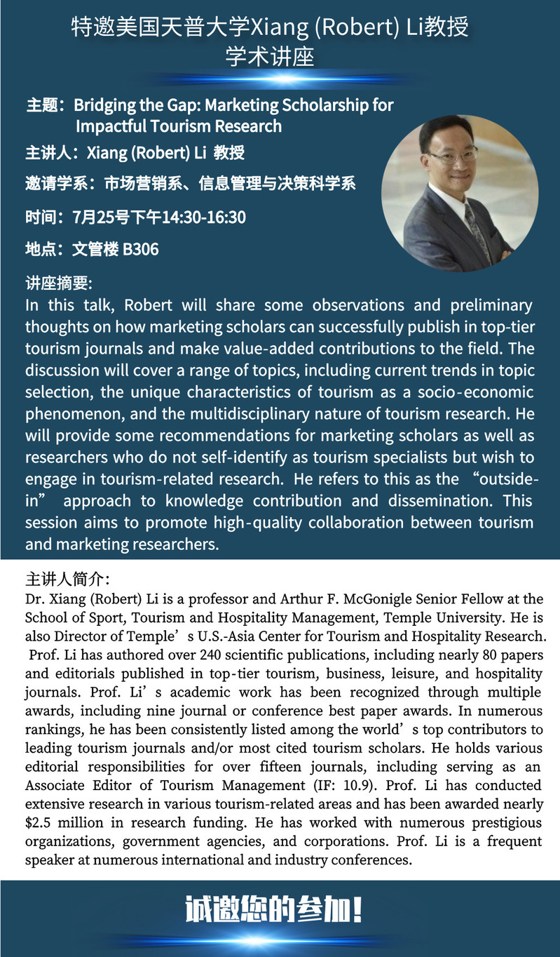 邀请美国天普大学Xiang (Robert) Li教授学术报告