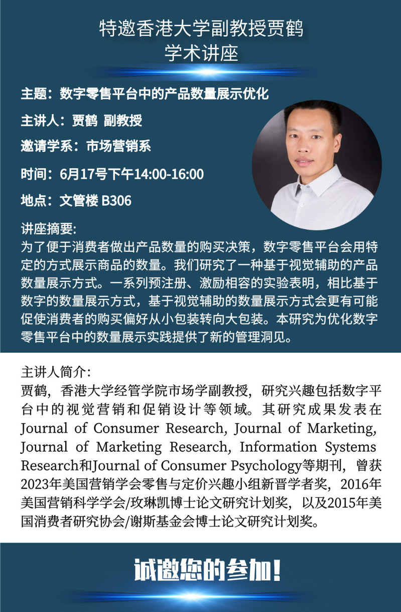 邀请香港大学经管学院贾鹤副教授学术报告