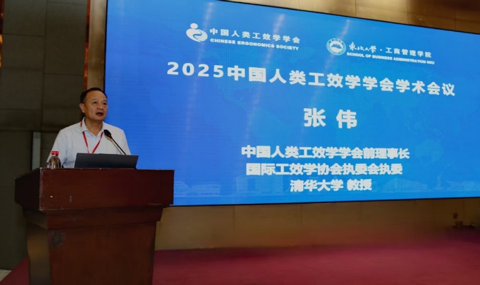 中国人类工效学学会前任理事长、清华大学张伟教授致辞。张伟介绍了中国人类工效学学会的发展历程,肯定了中国人类工效学学会在国际工效学协会中的地位和作用,以及我国人类工效学学者取得的成绩,并分析了工效学发展面临的机遇与挑战。