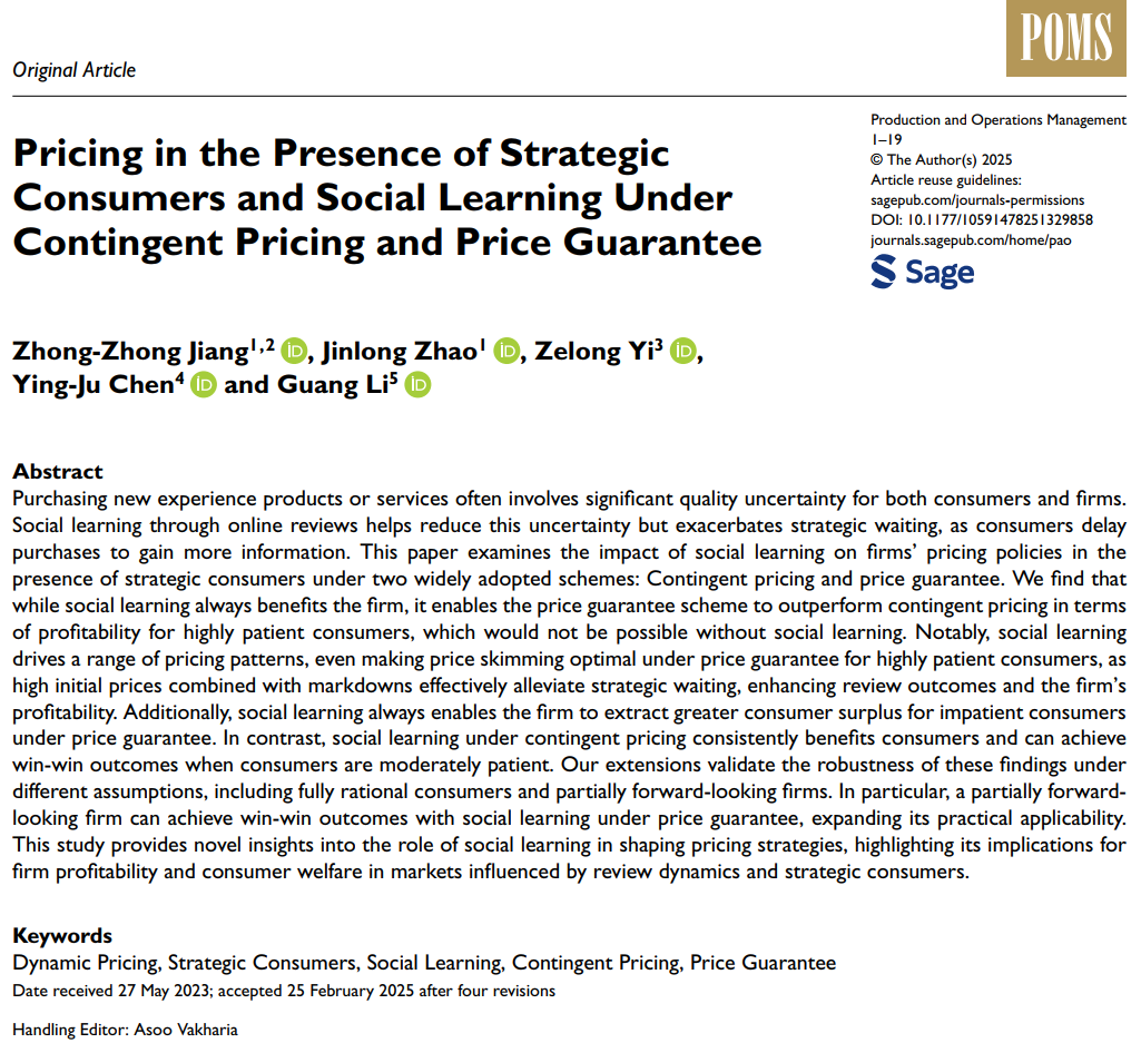 近日,欧博abg官网登入口蒋忠中教授团队牵头的研究成果《Pricing in the Presence of Strategic Consumers and Social Learning Under Contingent Pricing and Price Guarantee》被UTD24国际顶级期刊Production and Operations Management在线发表,实现了欧博abg官网师生共同在管理学国际顶级期刊论文发表的再次突破,是欧博abg官网高水平科学研究和高质量人才培养的重要体现和关键标志,将为助力学校“一流大学”特别是管理科学与工程学科建设贡献力量。研究成果由欧博abg官网登入口蒋忠中教授、赵金龙博士生、深圳大学经济学院弋泽龙教授、香港科技大学Ying-Ju Chen教授、加拿大皇后大学Guang Li副教授合作完成。