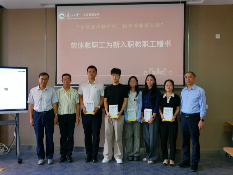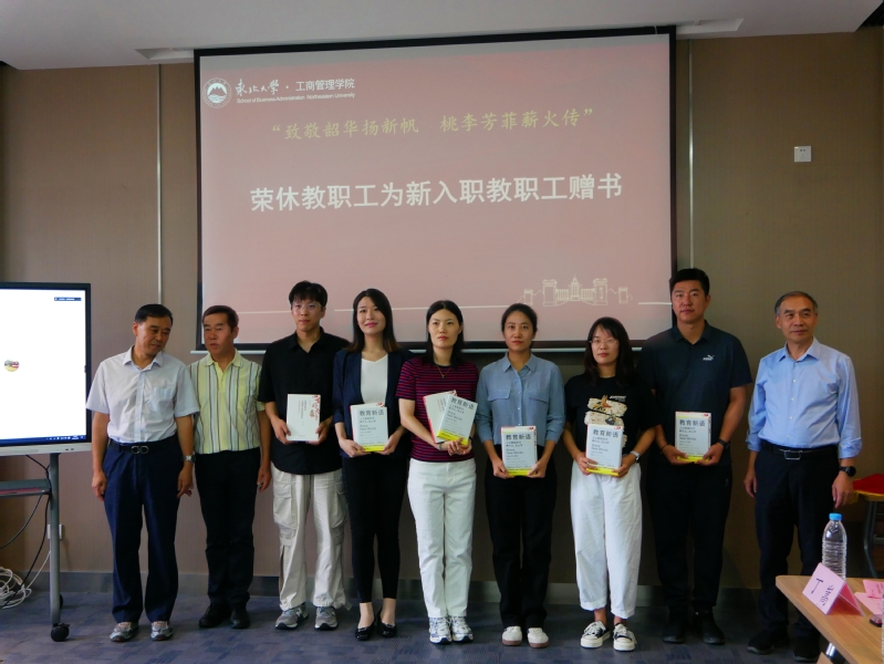 荣休教职工为新入职教职工赠予书籍《教育新语:人工智能时代教什么、怎么学?》《四有好老师系列丛书—道德情操是立德树人的重要条件》,书上分别有学院院长、党委书记的寄语和签名,寓意着学院新老管理人的责任传递和文化接续,以及师者初心和育人使命的精神传承。