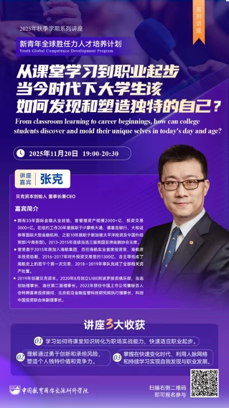 为培养“一精多会、一专多能”的高素质国际化人才,服务学校“双一流”建设,国际合作与交流处聚焦学生全球胜任力和国际竞争力培养,着力打造国际组织后备人才“蓄水池”。学校已推出的2025年度“新青年全球胜任力人才培养计划”现开展线上主题讲座,本次讲座面向【全校】开放,欢迎各位感兴趣的老师、同学积极参加讲座。